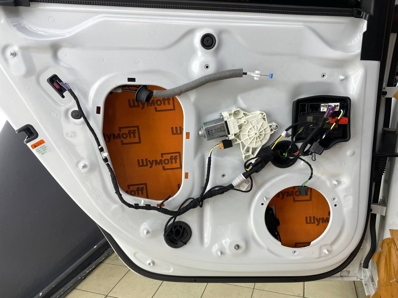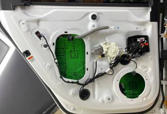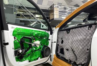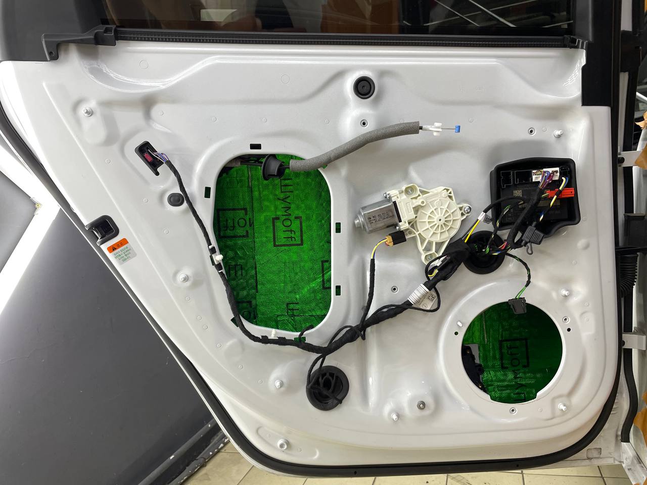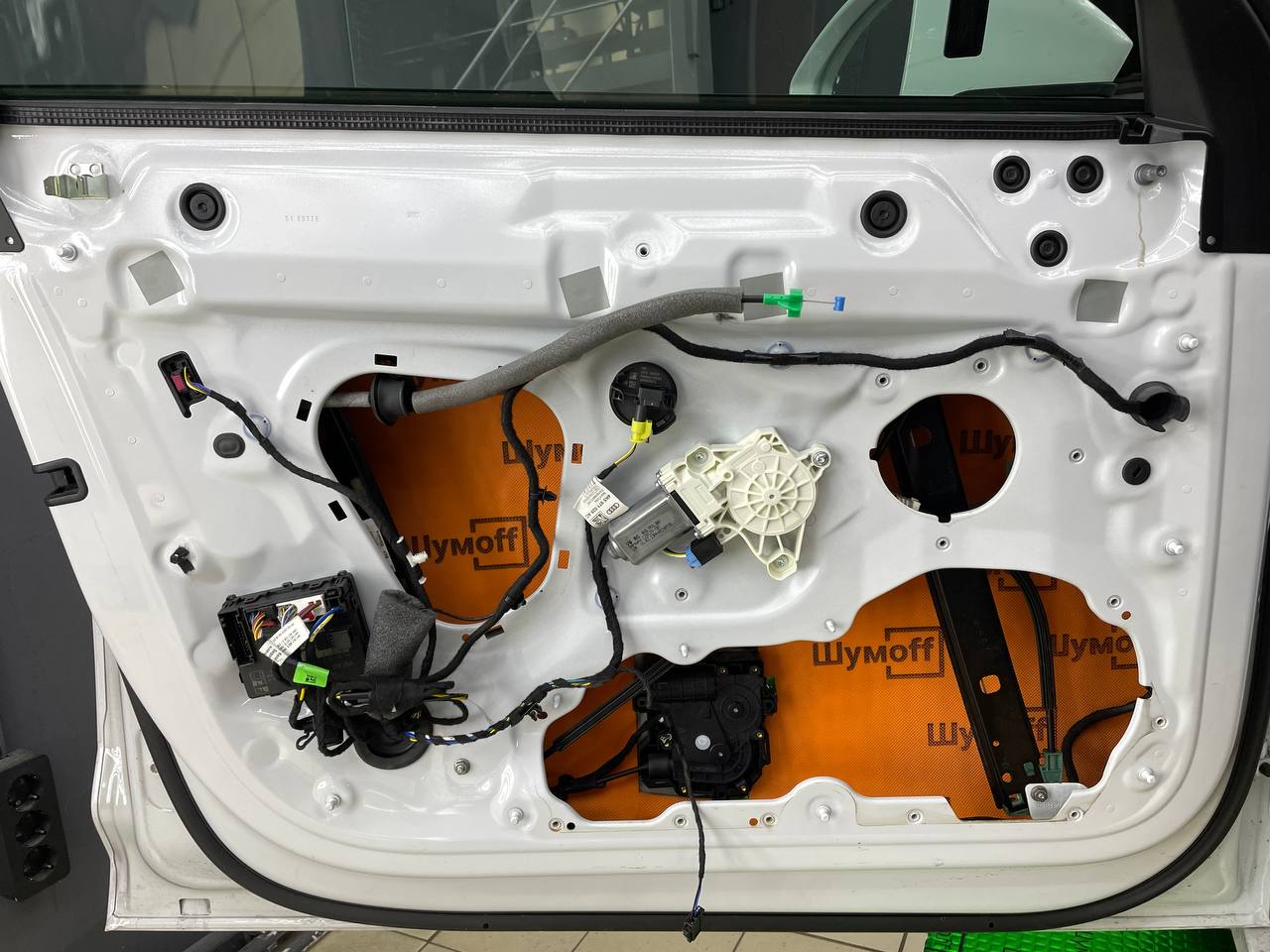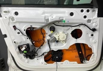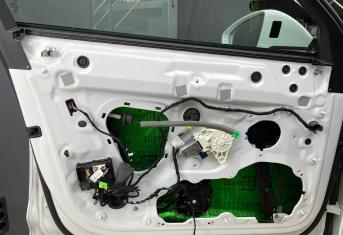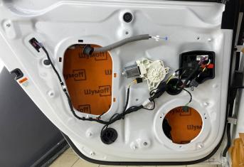 Вторую стенку двери обрабатываем Шумофф М2. Саму обшивку двери локально оклеиваем виброизоляцией Шумофф М2 для снижения резонанса пластика и полностью закрываем новым шумопоглощающим материалом от компании Шумофф, это Ultimat W17. По канту обшивки двери укладываем Шумофф Absorber 5, а на открытую проводку Шумофф Specific.