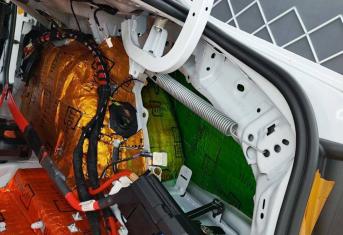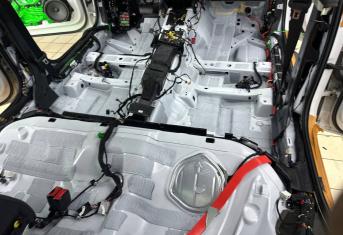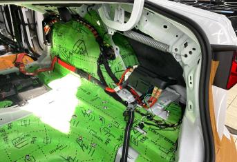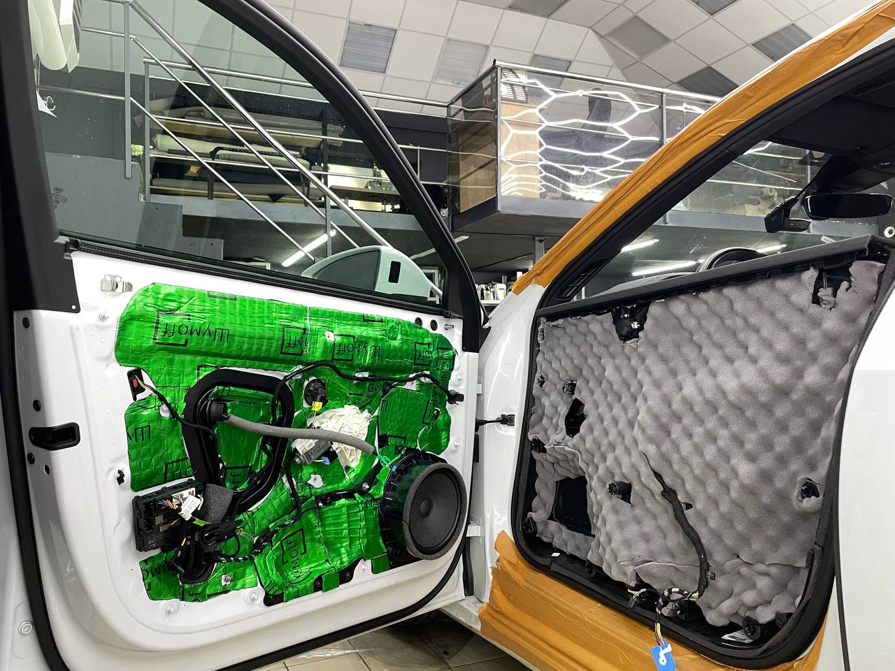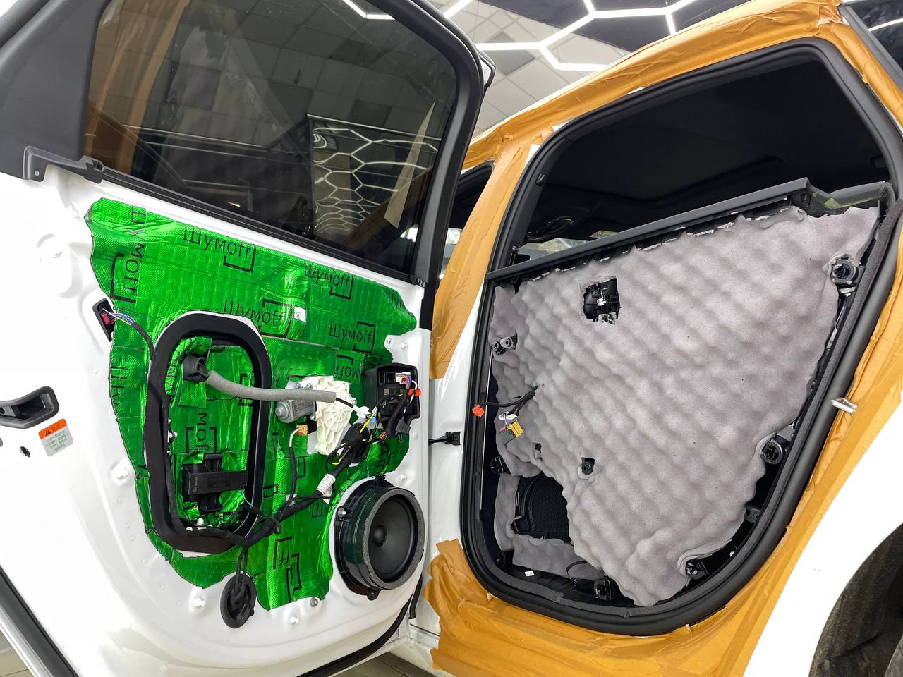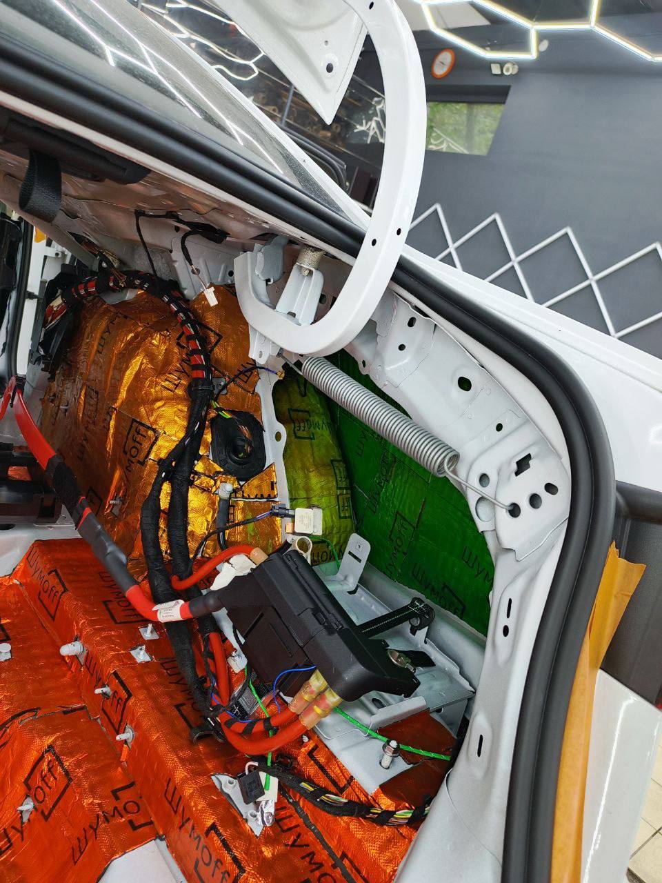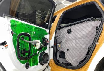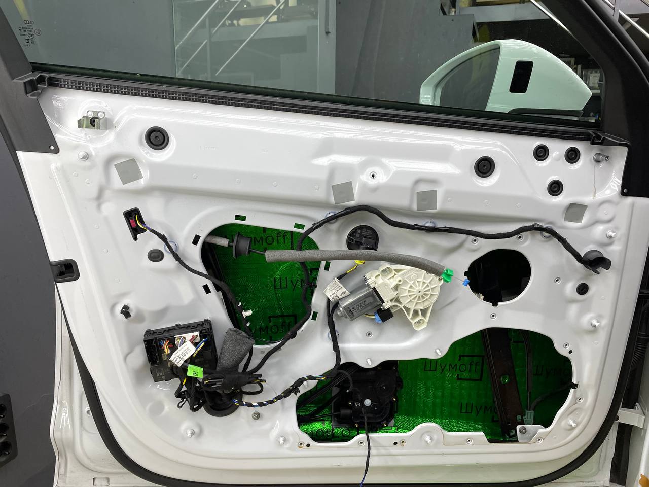 Вторую стенку двери обрабатываем Шумофф М2. Саму обшивку двери локально оклеиваем виброизоляцией Шумофф М2 для снижения резонанса пластика и полностью закрываем новым шумопоглощающим материалом от компании Шумофф, это Ultimat W17. По канту обшивки двери укладываем Шумофф Absorber 5, а на открытую проводку Шумофф Specific.