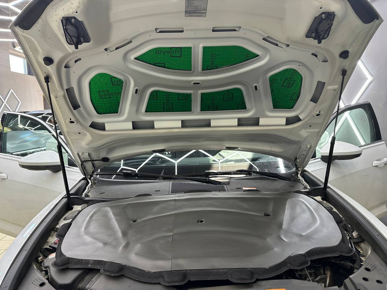 В технологические отверстия капота, на внешний металл, монтируем виброизоляцию Шумофф М2 и на штатную обивку применяем шумо-теплоизоляцию Practik Base 4.