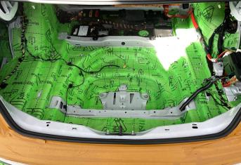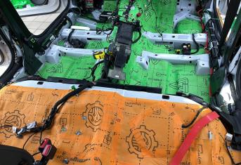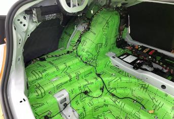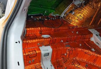 Вторым слоем для шумоизоляции пола мы используем Шумофф Парадокс для всей нижней части салона за исключением места под задним сидением, туда монтируем Шумофф Композит, чтобы избежать проблем со установкой заднего сидения. Это новые материалы от производителя Шумофф, которые включают в себя сразу два слоя и кратно повышают результативность. На задние крылья наносим шумопоглотитель Practick Flex A15.