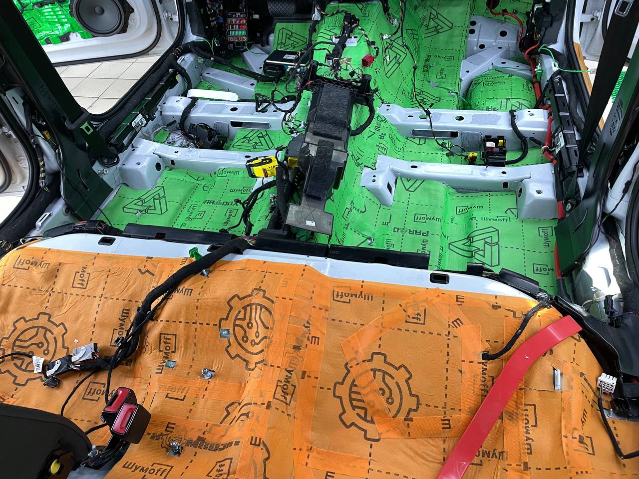 Приступаем к работам с полом, на разборку всего салона уходит около 1 часа. После чего мы подготавливаем поверхность, очистив ее от пыли и предварительно обезжирив. Штатная виброизоляция хорошо держится и её мы не демонтировали.