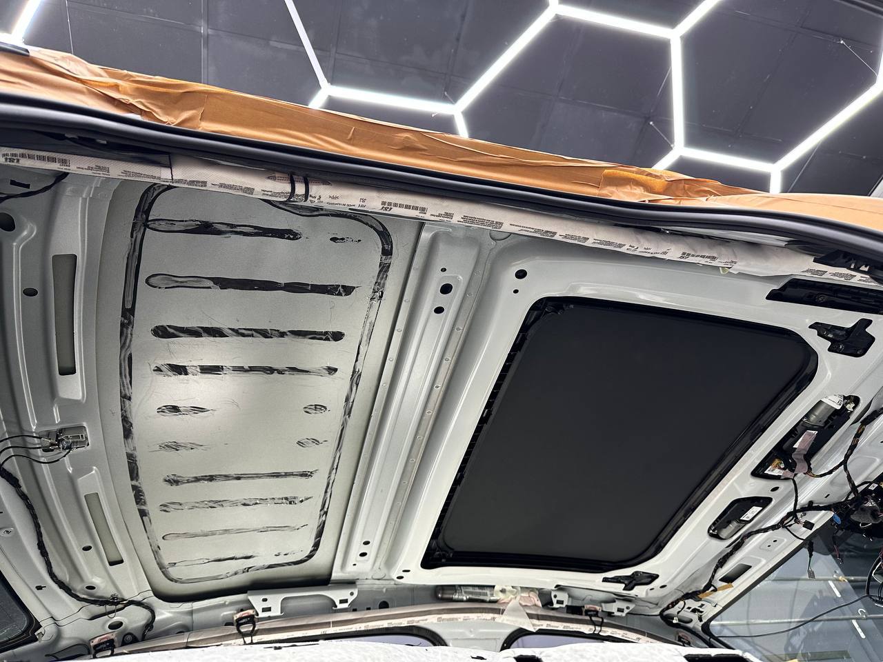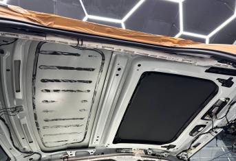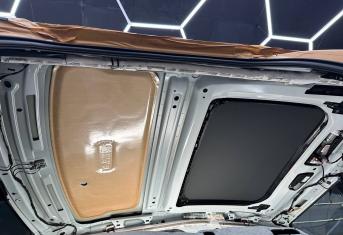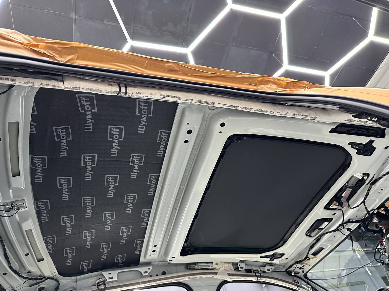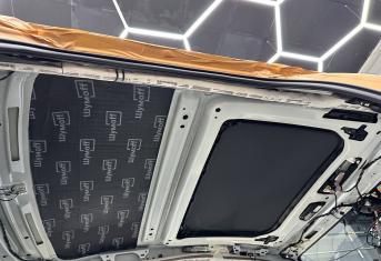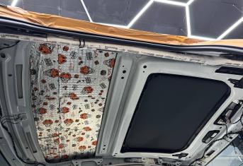 Первым слоем на крышу монтируем виброизоляцию Шумофф Jack. Второй слой шумо-теплоизоляция Шумофф Комфорт 3 для сохранения комфортной температуры внутри авто. Зимой все тепло уходит вверх, а если нет теплоизоляционной прослойки, оно не задерживается в салоне, так же как и летом стоя в пробке, солнце нагревает крышу автомобиля и тепло идет в салон. Именно по этой причине, мы обязательно во всех наших пакетах монтируем теплоизоляционную прослойку на крышу автомобиля. Сверху всё покрывается новым шумопоглотителем от компании Шумофф, это Velvet 7. Все материалы плотно прикатываются валиком по ровным плоскостям, исключая усилители и попадание воздуха.