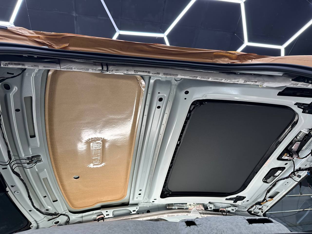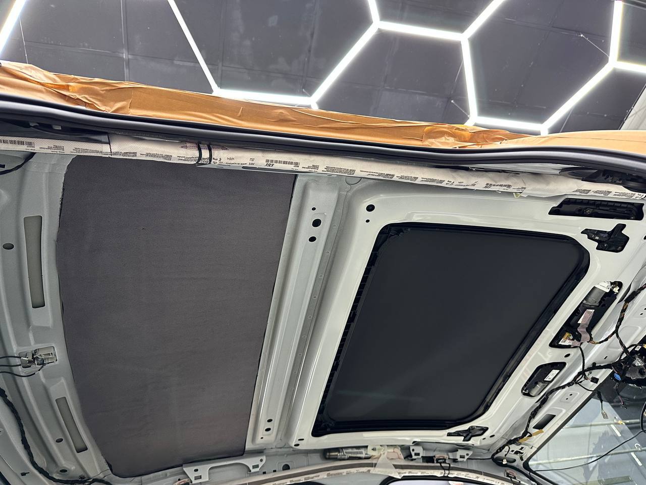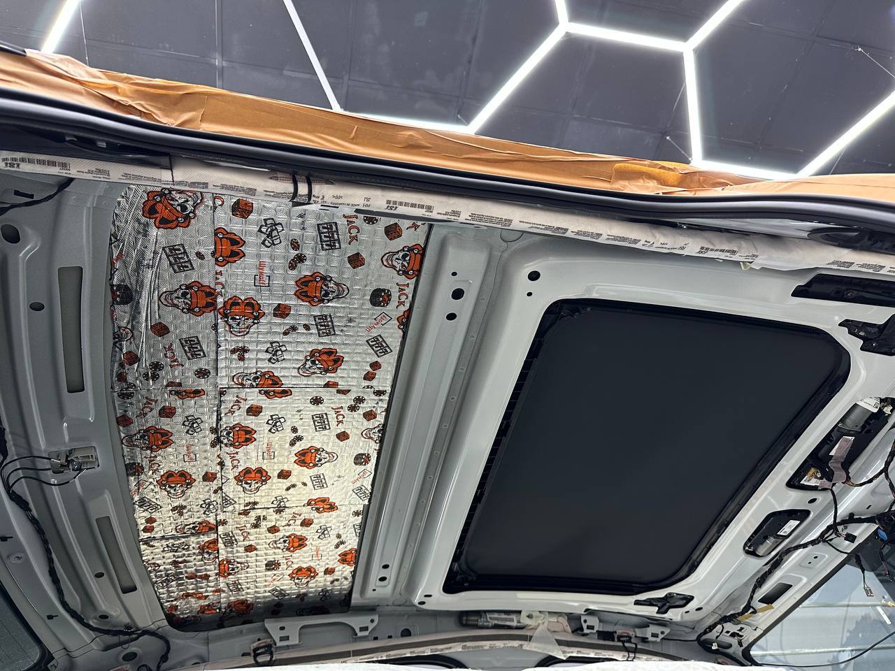Первым слоем на крышу монтируем виброизоляцию Шумофф Jack. Второй слой шумо-теплоизоляция Шумофф Комфорт 3 для сохранения комфортной температуры внутри авто. Зимой все тепло уходит вверх, а если нет теплоизоляционной прослойки, оно не задерживается в салоне, так же как и летом стоя в пробке, солнце нагревает крышу автомобиля и тепло идет в салон. Именно по этой причине, мы обязательно во всех наших пакетах монтируем теплоизоляционную прослойку на крышу автомобиля. Сверху всё покрывается новым шумопоглотителем от компании Шумофф, это Velvet 7. Все материалы плотно прикатываются валиком по ровным плоскостям, исключая усилители и попадание воздуха.