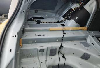 Штатная шумоизоляция в Ауди А6 С8 уложена выборочно. Напыление вибродемпфера есть на полу, в нише запасного колеса, полосы на задних арках и дверях. На крышу приклеен картон. И на этом всё - в остальном голый металл. Перед началом работ мы в обязательном порядке производим проверку качества монтажа заводского вибродемпфера с помощью специального инструмента. Ниже вы можете увидеть фотографии после полного разбора салона.