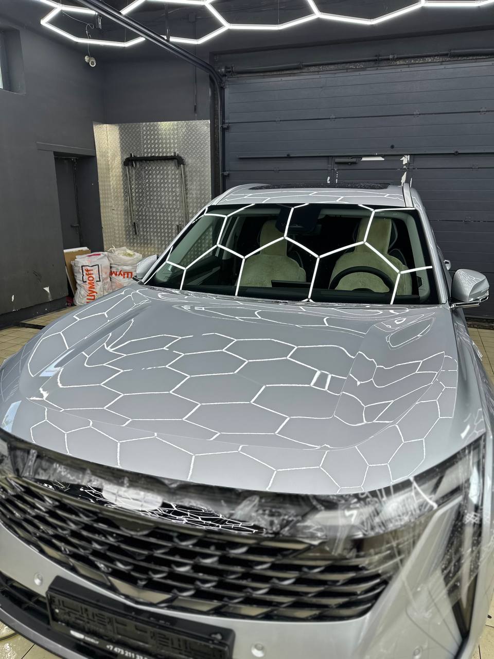 Далее не о процессе, а о конечном результате который получается на данном авто. Автомобиль будет меньше пачкаться, пленка обладает высоким гидрофобным эффектом и грязь не будет задерживаться на кузове. Ну и самое главное это защита, каждый оклеенный элемент выполнен с подворотом пленки по периметру. Сколы и царапины больше не угрожают оклеенным кузовным элементам данного автомобиля, и если вдруг произойдет неприятная ситуация с мелким ДТП к примеру во дворе, с большей долей вероятности этот вопрос решиться заменой пленки на отдельном элементе. Так же автомобиль обрел на долго гарантированный блеск, так как пленка имеет самозаживляющий эффект и мелкие риски и царапинки будут затягиваться под воздействием температуры.