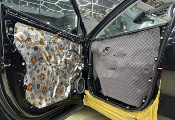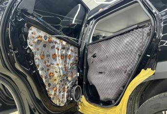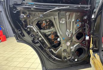 Третьим слоем применяем виброизоляцию Шумофф Jack на внутреннюю стенку двери. Проводку частично обрабатываем Шумофф Specific. Саму обшивку двери оклеиваем виброизоляцией Шумофф Jack и полностью закрываем шумопоглощающим материалом Шумофф Absorber А15. Обратите внимание, как тщательно мы обрабатываем двери виброизоляцией и шумопоглотителем - мы не экономим материал и щедро укладываем его в необходимые места. По канту обшивки двери и клипсы укладываем Шумофф Absorber 5, чтобы избежать раздражительных звуков и не портить ЛКП.