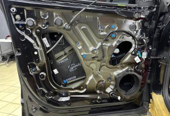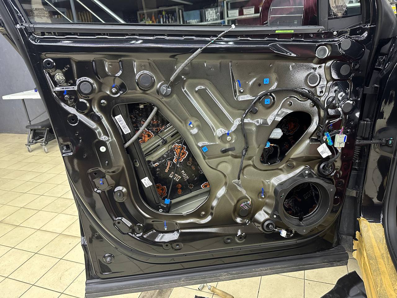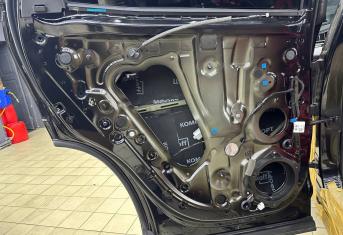 Начинаем работу с разборки дверей, подготовки поверхности и обезжириванию. Все работы по демонтажу пластика выполняются специальным инструментом. Мы гарантируем целостность клипс, креплений и отсутствие различного рода царапин, задиров на обшивках.