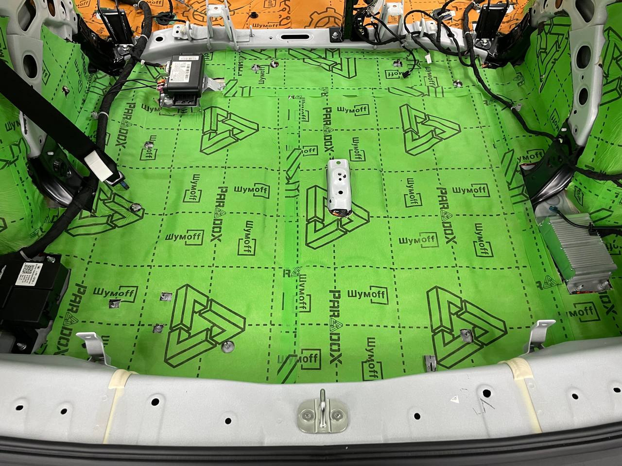 Вторым слоем для шумоизоляции пола мы используем Шумофф Парадокс для всей нижней части салона за исключением места под задним сидением, туда монтируем Шумофф Композит, чтобы избежать проблем со установкой заднего сидения. Это новые материалы от производителя Шумофф, которые включают в себя сразу два слоя и кратно повышают результативность. На задние крылья наносим шумопоглотитель Practick Flex A15.